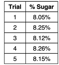 Your lab group carefully conducts five trials using the prescribed multi-step procedure and determines the percent sugar in the solution. Your results for the five trials are shown at the right. We want to discuss on this page how you would evaluate your results? What next steps could you take to answer the question