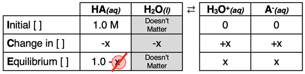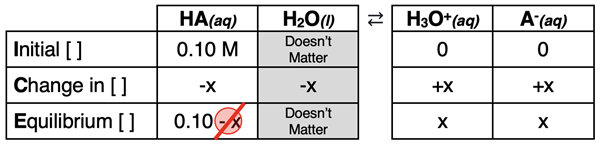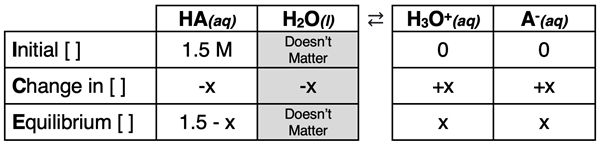 Our approach to acid dissociation problems is heavily reliant upon an ICE table (shown below). The initial concentration of acid – [HA]initial - is listed in the top or Initial row of the ICE table. This value is often provided in the problem statement. The amount of acid that is reacted is listed in the middle or Change row of the table. This value is sometimes calculated by substituting the concentration expressions in the bottom or Equilibrium row into the Ka equation.