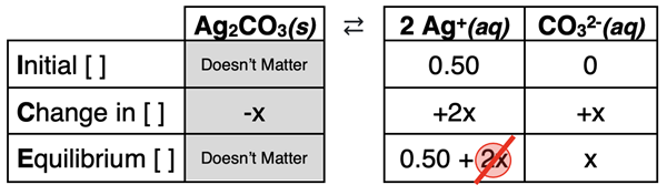 - Set up an ICE table. Use the initial concentration of the common ion in the top row of the table. Use the variable x to represent the amount of solid that dissolves. Use the simplifying assumption to reduce the math complexity.