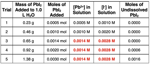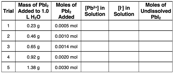 Its solubility is approximately 0.0014 mol/L. Five trials are performed with increasing amounts of PbI2 in each trial. The data for the mass and moles of the PbI2 added to 1.0 L of water are shown. Use your understanding to complete the table.