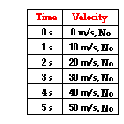 Since accelerating objects are constantly changing their velocity, one can say that the distance traveled/time is not a constant value. A falling object for instance usually accelerates as it falls. If we were to observe the motion of a free-falling object (free fall motion will be discussed in detail later), we would observe that the object averages a velocity of approximately 5 m/s in the first second, approximately 15 m/s in the second second, approximately 25 m/s in the third second, approximately 35 m/s in the fourth second, etc. Our free-falling object would be constantly accelerating. Given these average velocity values during each consecutive 1-second time interval, we could say that the object would fall 5 meters in the first second, 15 meters in the second second (for a total distance of 20 meters), 25 meters in the third second (for a total distance of 45 meters), 35 meters in the fourth second (for a total distance of 80 meters after four seconds). These numbers are summarized in the table below.