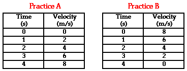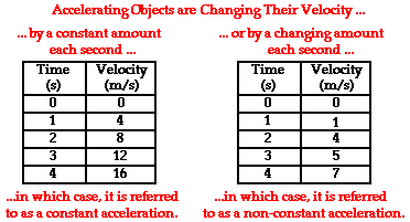 Sometimes an accelerating object will change its velocity by the same amount each second. As mentioned in the previous paragraph, the data table above show an object changing its velocity by 10 m/s in each consecutive second. This is referred to as a constant acceleration since the velocity is changing by a constant amount each second. An object with a constant acceleration should not be confused with an object with a constant velocity. Don't be fooled! If an object is changing its velocity -whether by a constant amount or a varying amount - then it is an accelerating object. And an object with a constant velocity is not accelerating. The data tables below depict motions of objects with a constant acceleration and a changing acceleration. Note that each object has a changing velocity.