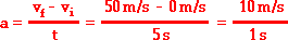 This equation can be used to calculate the acceleration of the object whose motion is depicted by the velocity-time data table above. The velocity-time data in the table shows that the object has an acceleration of 10 m/s/s. The calculation is shown below.