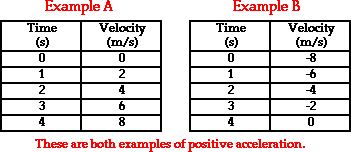 This general principle can be applied to determine whether the sign of the acceleration of an object is positive or negative, right or left, up or down, etc. Consider the two data tables below. In each case, the acceleration of the object is in the positive direction. In Example A, the object is moving in the positive direction (i.e., has a positive velocity) and is speeding up. When an object is speeding up, the acceleration is in the same direction as the velocity. Thus, this object has a positive acceleration. In Example B, the object is moving in the negative direction (i.e., has a negative velocity) and is slowing down. According to our general principle, when an object is slowing down, the acceleration is in the opposite direction as the velocity. Thus, this object also has a positive acceleration.