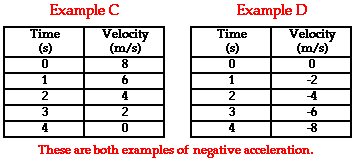 This same general principle can be applied to the motion of the objects represented in the two data tables below. In each case, the acceleration of the object is in the negative direction. In Example C, the object is moving in the positive direction (i.e., has a positive velocity) and is slowing down. According to our principle, when an object is slowing down, the acceleration is in the opposite direction as the velocity. Thus, this object has a negative acceleration. In Example D, the object is moving in the negative direction (i.e., has a negative velocity) and is speeding up. When an object is speeding up, the acceleration is in the same direction as the velocity. Thus, this object also has a negative acceleration.