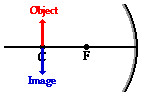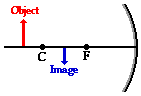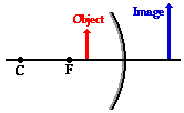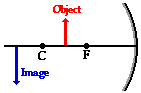 When the object is located in front of the center of curvature, the image will be located beyond the center of curvature. Regardless of exactly where the object is located between C and F, the image will be located somewhere beyond the center of curvature. In this case, the image will be inverted (i.e., a right side up object results in an upside-down image). The image dimensions are larger than the object dimensions. A six-foot tall person would have an image that is larger than six feet tall; the absolute value of the magnification is greater than 1. Finally, the image is a real image. Light rays actually converge at the image location. As such, the image of the object could be projected upon a sheet of paper.