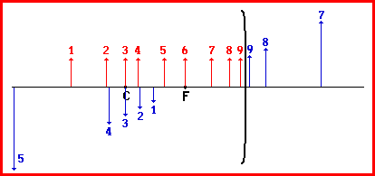 It might be noted from the above descriptions that there is a relationship between the object distance and object size and the image distance and image size. Starting from a large value, as the object distance decreases (i.e., the object is moved closer to the mirror), the image distance increases; meanwhile, the image height increases. At the center of curvature, the object distance equals the image distance and the object height equals the image height. As the object distance approaches one focal length, the image distance and image height approaches infinity. Finally, when the object distance is equal to exactly one focal length, there is no image. Then altering the object distance to values less than one focal length produces images that are upright, virtual and located on the opposite side of the mirror. Finally, if the object distance approaches 0, the image distance approaches 0 and the image height ultimately becomes equal to the object height. These patterns are depicted in the diagram below. Nine different object locations are drawn and labeled with a number; the corresponding image locations are drawn in blue and labeled with the identical number.