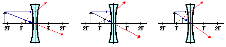 Previously in Lesson 5, ray diagrams were constructed in order to determine the location, size, orientation, and type of image formed by double concave lenses (i.e., diverging lenses). The ray diagram constructed earlier for a diverging lens revealed that the image of the object was virtual, upright, reduced in size and located on the same side of the lens as the object. But will these always be the characteristics of an image produced by a double concave lens? Can convex lenses ever produce real images? Inverted images? Magnified Images? To answer these questions, we will look at three different ray diagrams for objects positioned at different locations along the principal axis. The diagrams are shown below. (Note that only two sets of incident and refracted rays were used in the diagram in order to avoid overcrowding the diagram with rays.)