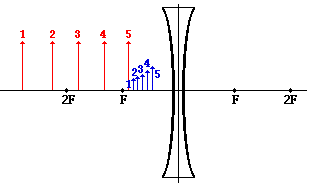 Another characteristic of the images of objects formed by diverging lenses pertains to how a variation in object distance affects the image distance and size. The diagram below shows five different object locations (drawn and labeled in red) and their corresponding image locations (drawn and labeled in blue).