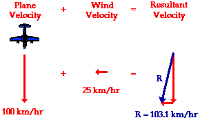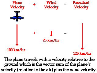 To illustrate this principle, consider a plane flying amidst a tailwind. A tailwind is merely a wind that approaches the plane from behind, thus increasing its resulting velocity. If the plane is traveling at a velocity of 100 km/hr with respect to the air, and if the wind velocity is 25 km/hr, then what is the velocity of the plane relative to an observer on the ground below? The resultant velocity of the plane (that is, the result of the wind velocity contributing to the velocity due to the plane's motor) is the vector sum of the velocity of the plane and the velocity of the wind. This resultant velocity is quite easily determined if the wind approaches the plane directly from behind. As shown in the diagram below, the plane travels with a resulting velocity of 125 km/hr relative to the ground.