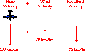 If the plane encounters a headwind, the resulting velocity will be less than 100 km/hr. Since a headwind is a wind that approaches the plane from the front, such a wind would decrease the plane's resulting velocity. Suppose a plane traveling with a velocity of 100 km/hr with respect to the air meets a headwind with a velocity of 25 km/hr. In this case, the resultant velocity would be 75 km/hr; this is the velocity of the plane relative to an observer on the ground. This is depicted in the diagram below.