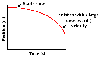 Observe that the line on the graph curves. As learned earlier, a curved line on a position versus time graph signifies an accelerated motion. Since a free-falling object is undergoing an acceleration (g = 9.8 m/s/s), it would be expected that its position-time graph would be curved. A further look at the position-time graph reveals that the object starts with a small velocity (slow) and finishes with a large velocity (fast). Since the slope of any position vs. time graph is the velocity of the object (as learned in Lesson 3), the small initial slope indicates a small initial velocity and the large final slope indicates a large final velocity. Finally, the negative slope of the line indicates a negative (i.e., downward) velocity.