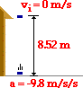 The solution to this problem begins by the construction of an informative diagram of the physical situation. This is shown below. The second step involves the identification and listing of known information in variable form. You might note that in the statement of the problem, there is only one piece of numerical information explicitly stated: 8.52 meters. The displacement (d) of the shingles is -8.52 m. (The - sign indicates that the displacement is downward). The remaining information must be extracted from the problem statement based upon your understanding of the above principles. For example, the vi value can be inferred to be 0 m/s since the shingles are dropped (released from rest; see note above). And the acceleration (a) of the shingles can be inferred to be -9.8 m/s2 since the shingles are free-falling (see note above). (Always pay careful attention to the + and - signs for the given quantities.) The next step of the solution involves the listing of the unknown (or desired) information in variable form. In this case, the problem requests information about the time of fall. So t is the unknown quantity. The results of the first three steps are shown in the table below.