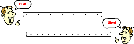 The distance between dots on a dot diagram represents the object's position change during that time interval. A large distance between dots indicates that the object was moving fast during that time interval. A small distance between dots means the object was moving slow during that time interval. Dot diagrams for a fast- and slow-moving object are depicted below.