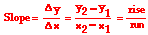 The slope equation says that the slope of a line is found by determining the amount of rise of the line between any two points divided by the amount of run of the line between the same two points. A method for carrying out the calculation is