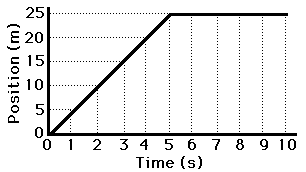 If the position-time data for such a car were graphed, then the resulting graph would look like the graph at the right. For the first five seconds the line on the graph slopes up 5 meters for every 1 second along the horizontal (time) axis. That is, the line on the position vs. time graph has a slope of +5 meters/1 second for the first five seconds. Thus, the slope of the line on the graph equals the velocity of the car. During the last 5 seconds (5 to 10 seconds), the line slopes up 0 meters. That is, the slope of the line is 0 m/s - the same as the velocity during this time interval.