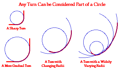 The most common example of the physics of circular motion in sports involves the turn. It could be a halfback in football making a turn around the corner of the line. Or it could be a softball player running the bases and making a turn around second base. Or it could be a bobsled in the Olympic games making a turn around a corner on the track. Whatever turning motion it happens to be, you can be sure that turning a corner involves circular motion principles. Now for certain not all turns involve a complete circle; nor do all turns have a perfectly circular shape. Some turns are only one-quarter of a turn - such as the fullback rounding the corner of the line in football. And some turns are hardly circular whatsoever. Nonetheless, any turn can be approximated as being a part of a larger circle or a part of several circles of varying size. A sharp turn can be considered part of a small circle. A more gradual turn is part of a larger circle. Some turns can begin sharply and gradually change in sharpness, or vice versa. In all cases, the motion around a turn can be approximated as part of a circle or a collection of circles. The diagram below depicts a variety of paths that a turn could make.