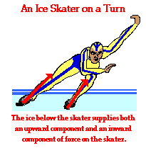 Because turning a corner involves the motion of an object that is momentarily moving along the path of a circle, both the concepts and the mathematics of circular motion can be applied to such a motion. Conceptually, such an object is moving with an inward acceleration - the inward direction being towards the center of whatever circle the object is moving along. There would also be a centripetal force requirement for such a motion. That is, there must be some object supplying an inward force or inward component of force. When a person makes a turn on a horizontal surface, the person often leans into the turn. By leaning, the surface pushes upward at an angle to the vertical. As such, there is both a horizontal and a vertical component resulting from contact with the surface below. This contact force supplies two roles - it balances the downward force of gravity and meets the centripetal force requirement for an object in uniform circular motion. The upward component of the contact force is sufficient to balance the downward force of gravity and the horizontal component of the contact force pushes the person towards the center of the circle. This contact force is depicted in the diagram below for a speed skater making a turn on ice.