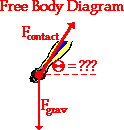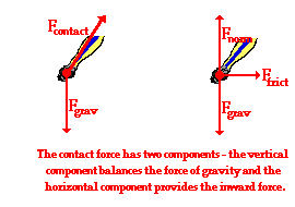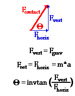 Step 3 of the suggested method involves resolving any forces that act at angles into horizontal and vertical components. This is shown in the diagram at the right. The contact force can be broken into two components - Fhoriz and Fvert. The vertical component of force would balance the force of gravity; and as such, the vertical component will be equal in magnitude to the force of gravity. The horizontal component of force remains unbalanced. As mentioned in the above discussion, this horizontal component is the net inward force; and as such, Fhoriz is equal to m*a. Finally, the two components are related to the angle of lean by the tangent function. Simple algebraic manipulation would yield the relationship shown in the graphic at the right. So the angle of lean can be found if the vertical and horizontal components of force are known.