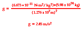 The above equation demonstrates that the acceleration of gravity is dependent upon the mass of the earth (approx. 5.98x1024 kg) and the distance (d) that an object is from the center of the earth. If the value 6.38x106 m (a typical earth radius value) is used for the distance from Earth's center, then g will be calculated to be 9.8 m/s2. And of course, the value of g will change as an object is moved further from Earth's center. For instance, if an object were moved to a location that is two earth-radii from the center of the earth - that is, two times 6.38x106 m - then a significantly different value of g will be found. As shown below, at twice the distance from the center of the earth, the value of g becomes 2.45 m/s2.
