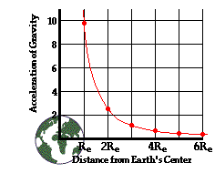 As is evident from both the equation and the table above, the value of g varies inversely with the distance from the center of the earth. In fact, the variation in g with distance follows an inverse square law where g is inversely proportional to the distance from earth's center. This inverse square relationship means that as the distance is doubled, the value of g decreases by a factor of 4. As the distance is tripled, the value of g decreases by a factor of 9. And so on. This inverse square relationship is depicted in the graphic at the right.