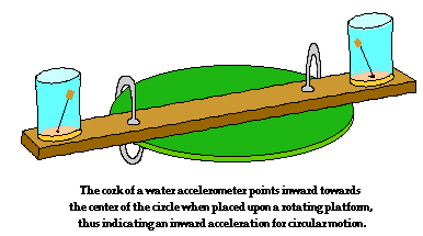 The acceleration of an object is often measured using a device known as an accelerometer. A simple accelerometer consists of an object immersed in a fluid such as water. Consider a sealed jar that is filled with water. A cork attached to the lid by a string can serve as an accelerometer. To test the direction of acceleration for an object moving in a circle, the jar can be inverted and attached to the end of a short section of a wooden 2x4. A second accelerometer constructed in the same manner can be attached to the opposite end of the 2x4. If the 2x4 and accelerometers are clamped to a rotating platform and spun in a circle, the direction of the acceleration can be clearly seen by the direction of lean of the corks. As the cork-water combination spins in a circle, the cork leans towards the center of the circle. The least massive of the two objects always leans in the direction of the acceleration. In the case of the cork and the water, the cork is less massive (on a per mL basis) and thus it experiences the greater acceleration. Having less inertia (owing to its smaller mass on a per mL basis), the cork resists the acceleration the least and thus leans to the inside of the jar towards the center of the circle. This is observable evidence that an object moving in circular motion at constant speed experiences an acceleration that is directed towards the center of the circle.