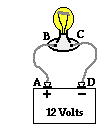 3. The diagram at the right shows a light bulb connected to a 12-V car battery. The + and - terminals are shown.