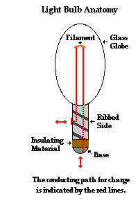 A light bulb is a relatively simple device consisting of a filament resting upon or somehow attached to two wires. The wires and the filament are conducting materials that allow charge to flow through them. One wire is connected to the ribbed sides of the light bulbs. The other wire is connected to the bottom base of the light bulb. The ribbed edge and the bottom base are separated by an insulating material that prevents the direct flow of charge between the bottom base and the ribbed edge. The only pathway by which charge can make it from the ribbed edge to the bottom base or vice versa is the pathway that includes the wires and the filament. Charge can either enter the ribbed edge, make the pathway through the filament and exit out the bottom base; or it can enter the bottom base, make the pathway through the filament and exit out the ribbed edge. As such, there are two possible entry points and two corresponding exit points.