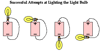Once one group of students successfully lights the bulb, many other lab groups quickly follow suit. But then the question emerges as to what other ways that the cell, bulb and bare wire can be arranged in such a manner as to light the bulb. Often a short light bulb anatomy lesson prompts the lab groups into a quick discovery of one or more of the remaining arrangements.