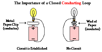 There are two requirements that must be met to establish an electric circuit. The first is clearly demonstrated by the above activity. There must be a closed conducting path that extends from the positive terminal to the negative terminal. It is not enough that there is simply a closed conducting loop; the loop itself must extend from the positive terminal to the negative terminal of the electrochemical cell. An electric circuit is like a water circuit at a water park. The flow of charge through wires is similar to the flow of water through the pipes and along the slides at a water park. If a pipe gets plugged or broken such that water cannot make the complete path through the circuit, then the flow of water will soon cease. In an electric circuit, all connections must be made and made by conducting materials capable of carrying charge. As the cell, bulb and wire experiment continues, some students explore the capability of various materials to carry a charge by inserting them in their circuit. Metallic materials are conductors and can be inserted into the circuit to successfully light the bulb. On the other hand, paper and plastic materials are typically insulators and their insertion within the circuit will hinder the flow of charge to such a degree that the current ceases and the bulb no longer lights. There must be a closed conducting loop from the positive to the negative terminal in order to establish a circuit and to have a current.