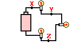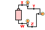 6. Three identical light bulbs are connected to a battery as shown at the right. W, X,Y and Z represent locations along the circuit. Which one of the following statements is true?