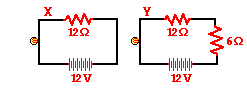 7. Compare circuit X and Y below. Each is powered by a 12-volt battery. The voltage drop across the 12-ohm resistor in circuit Y is ____ the voltage drop across the single resistor in X.
