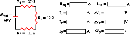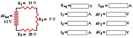 The above principles and formulae can be used to analyze a series circuit and determine the values of the current at and electric potential difference across each of the resistors in a series circuit. Their use will be demonstrated by the mathematical analysis of the circuit shown below. The goal is to use the formulae to determine the equivalent resistance of the circuit (Req), the current at the battery (Itot), and the voltage drops and current for each of the three resistors.
