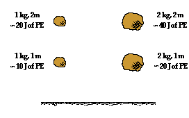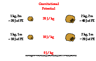 vertical position above the Earth. The amount of gravitational potential energy stored in an object depended upon the amount of mass the object possessed and the amount of height to which it was raised. Gravitational potential energy depended upon object mass and object height. An object with twice the mass would have twice the potential energy and an object with twice the height would have twice the potential energy. It is common to refer to high positions as high potential energy locations. A glance at the diagram at the right reveals the fallacy of such a statement. Observe that the 1 kg mass held at a height of 2 meters has the same potential energy as a 2 kg mass held at a height of 1 meter. Potential energy depends upon more than just location; it also depends upon mass. In this sense, gravitational potential energy depends upon at least two types of quantities: