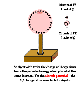 be pushed; in this case, the direction is outward away from the Van de Graaff sphere. Work would be required to move a positive test charge towards the sphere against the electric field. The amount of force involved in doing the work is dependent upon the amount of charge being moved (according to Coulomb's law of electric force). The greater the charge on the test charge, the greater the repulsive force and the more work that would have to be done on it to move it the same distance. If two objects of different charge - with one being twice the charge of the other - are moved the same distance into the electric field, then the object with twice the charge would require twice the force and thus twice the amount of work. This work would change the potential energy by an amount that is equal to the amount of work done. Thus, the electric potential energy is dependent upon the amount of charge on the object experiencing the field and upon the location within the field. Just like gravitational potential energy, electric potential energy is dependent upon at least two types of quantities: