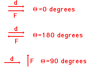 where F is the force, d is the displacement, and the angle (theta) is defined as the angle between the force and the displacement vector. Perhaps the most difficult aspect of the above equation is the angle "theta." The angle is not just any 'ole angle, but rather a very specific angle. The angle measure is defined as the angle between the force and the displacement. To gather an idea of it's meaning, consider the following three scenarios.