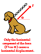 The equation for work lists three variables - each variable is associated with one of the three key words mentioned in the definition of work (force, displacement, and cause). The angle theta in the equation is associated with the amount of force that causes a displacement. As mentioned in a previous unit, when a force is exerted on an object at an angle to the horizontal, only a part of the force contributes to (or causes) a horizontal displacement. Let's consider the force of a chain pulling upwards and rightwards upon Fido in order to drag Fido to the right. It is only the horizontal component of the tension force in the chain that causes Fido to be displaced to the right. The horizontal component is found by multiplying the force F by the cosine of the angle between F and d. In this sense, the cosine theta in the work equation relates to the cause factor - it selects the portion of the force that actually causes a displacement.