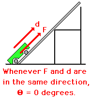 When determining the measure of the angle in the work equation, it is important to recognize that the angle has a precise definition - it is the angle between the force and the displacement vector. Be sure to avoid mindlessly using any 'ole angle in the equation. A common physics lab involves applying a force to displace a cart up a ramp to the top of a chair or box. A force is applied to a cart to displace it up the incline at constant speed. Several incline angles are typically used; yet, the force is always applied parallel to the incline. The displacement of the cart is also parallel to the incline. Since F and d are in the same direction, the angle theta in the work equation is 0 degrees. Nevertheless, most students experienced the strong temptation to measure the angle of incline and use it in the equation. Don't forget: the angle in the equation is not just any 'ole angle. It is defined as the angle between the force and the displacement vector.
