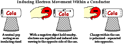 To illustrate this induced movement of electrons, we will consider an aluminum pop can that is taped to a Styrofoam cup. The Styrofoam cup serves as both an insulating stand and a handle. A rubber balloon is charged negatively, perhaps by rubbing it against animal fur. If the negatively charged balloon is brought near the aluminum pop can, the electrons within the pop can will experience a repulsive force. The repulsion will be greatest for those electrons that are nearest the negatively charged balloon. Many of these electrons will be induced into moving away from the repulsive balloon. Being present within a conducting material, the electrons are free to move from atom to atom. As such, there is a mass migration of electrons from the balloon's side of the aluminum can towards the opposite side of the can. This electron movement leaves atoms on the balloon's side of the can with a shortage of electrons; they become positively charged. And the atoms on the side opposite of the can have an excess of electrons; they become negatively charged. The two sides of the aluminum pop can have opposite charges. Overall the can is electrically neutral; it's just that the positive and negative charge has been separated from each other. We say that the charge in the can has been polarized.
