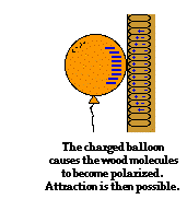 positive charges towards the negatively charged balloon. The distortion of their electron clouds will result in an alignment of the wood molecules in a manner that makes the wooden cabinet attracted to the negatively charged balloon. In human terms, one might say that the wood does some quick grooming and then places its most attractive side towards the balloon and its most repulsive side away from the balloon. In the world of static electricity, closeness counts. The negative balloon is closer to the positive portion of the wood molecules and further from the more repulsive negative portion. The balloon and the wall attract with sufficient force to cause the balloon to stick to the wall. From a mechanics standpoint, we would say that the balloon and the wall are pressed together with a large force. The large normal force on the balloon results in a large static friction force. This friction force balances the downward force of gravity and the balloon remains at rest.