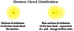 The electrons surrounding the nucleus of an atom are believed to be located in regions of space with specific shapes and sizes. The actual size and shape of these regions is determined by the high-powered mathematical equations common to Quantum Mechanics. Rather than being located a specific distance from the nucleus in a fixed orbit, the electrons are simply thought of as being located in regions often referred to as electron clouds. At any given moment, the electron is likely to be found at some location within the cloud. The electron clouds have varying density; the density of the cloud is considered to be greatest in the portion of the cloud where the electron has the greatest probability of being found at any given moment. And conversely, the electron cloud density is least in the regions where the electron is least likely to be found. In addition to having varying density, these electron clouds are also highly distortable. The presence of neighboring atoms with high electron affinity can distort the electron clouds around atoms. Rather than being located symmetrically about the positive nucleus, the cloud becomes asymmetrically shaped. As such, there is a polarization of the atom as the centers of positive and negative charge are no longer located in the same location. The atom is still a neutral atom; it has just become polarized.