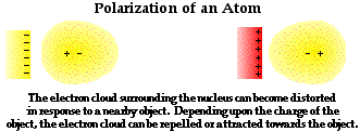 A complete discussion of the world of atoms, molecules and chemical bonds is beyond the scope of The Physics Classroom. Nonetheless, a model of the atom as a distortable cloud of negative electrons surrounding a positive nucleus becomes essential to understanding how an insulating material can be polarized. If a charged object is brought near an insulator, the charges on that object are capable of distorting the electron clouds of the insulator atoms. There is a polarization of the neutral atoms. As shown in the diagrams below, the neutral atoms of the insulator will orient themselves in such a manner as to place the more attractive charge nearest the charged object. Once polarized in this manner, opposites can now attract.