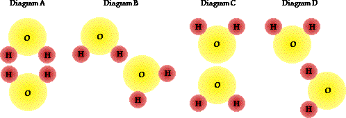 3. The distribution of electric charge in a H2O molecule is nonuniform. The more electronegative oxygen atom attracts electrons from the hydrogen atom. Thus, the oxygen atoms acquire a partial negative charge and the hydrogen atoms acquire a partial positive charge. The water molecule is "polarized." Which diagram(s) below correctly portray(s) a pair of H2O molecules? Explain.
