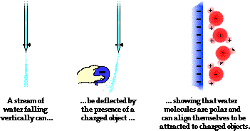 Another common physics (and chemistry) demonstration involves using a charged object to deflect a stream of water from its path. Most often, a comb is charged negatively by combing one's hair or a rubber balloon is charged in a similar manner. The negatively charged object is then brought near to a falling stream of water, causing the stream to be attracted to the comb or balloon and alter its direction of fall. The demonstration illustrates the polar nature of water molecules. The hydrogen atoms serve as the positive poles within a water molecule; oxygen serves as the negative pole. Molecules of a liquid are free to rotate and move about; the water molecules realign themselves in order to put their positive poles towards the negatively charged object. Once polarized, the stream and the balloon (or comb) are attracted. As the water molecules within the stream fall past the balloon, this realignment of individual molecules happens quickly and the entire stream is deflected from its original downward direction.