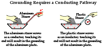 Any object can be grounded provided that the charged atoms of that object have a conducting pathway between the atoms and the ground. A common lab activity involves taping two straws to a charged aluminum plate. One straw is covered with aluminum foil and the other straw is bare plastic. When the aluminum-covered straw is touched, the aluminum plate loses its charge. It is grounded by means of the movement of electrons from the ground to the aluminum plate. When the plastic straw is touched, grounding does not occur. The plastic serves as an insulator and prevents the flow of electrons from the ground to the aluminum plate. Grounding requires a conducting pathway between the ground and the object to be grounded. Electrons will travel along that pathway.