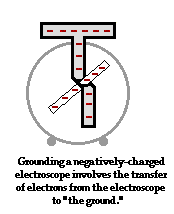 To begin our discussion of grounding, we will consider the grounding of a negatively charged electroscope. Any negatively charged object has an excess of electrons. If it is to have its charge removed, then it will have to lose its excess electrons. Once the excess electrons are removed from the object, there will be equal numbers of protons and electrons within the object and it will have a balance of charge. To remove the excess of electrons from a negatively charged electroscope, the electroscope will have to be connected by a conducting pathway to another object that is capable of receiving those electrons. The other object is the ground. In typical electrostatic experiments and demonstrations, this is simply done by touching the electroscope with one's hand. Upon contact, the excess electrons leave the electroscope and enter the person who touches it. These excess electrons subsequently spread about the surface of the person.