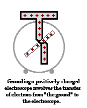 The previous discussion describes the grounding of a negatively charged electroscope. Electrons were transferred from the electroscope to the ground. But what if the electroscope is positively charged? How does electron transfer allow an object with an excess of protons to become neutralized? To explore these questions, we will consider the grounding of a positively charged electroscope. A positively charged electroscope must gain electrons in order to acquire an equal number of protons and electrons. By gaining electrons from the ground, the electroscope will have a balance of charge and therefore be neutral. Thus, the grounding of a positively charged electroscope involves the transfer of electrons from the ground into the electroscope. This process works because excess positive charge on the electroscope attracts electrons from the ground (in this case, a person). While this may disrupt any balance of charge present on the person, the significantly larger size of the person allows for the excess charge to distance itself further from each other. As in the case of grounding a negatively charged electroscope, the grounding of a positively charged electroscope involves charge sharing. The excess positive charge is shared between the electroscope and the ground. And once again, the extent to which an object is willing to share excess charge is proportional to its size. The person is an effective ground because it has enough size to share the overwhelming majority of excess positive charge.