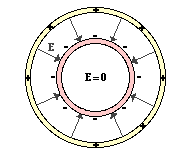 To illustrate this characteristic, let's consider the space between and inside of two concentric, conducting cylinders of different radii as shown in the diagram at the right. The outer cylinder is charged