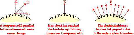 the foundation for the rationale behind why electric fields must be directed perpendicular to the surface of conducting objects. If there were a component of electric field directed parallel to the surface, then the excess charge on the surface would be forced into accelerated motion by this component. If a charge is set into motion, then the object upon which it is on is not in a state of electrostatic equilibrium. Therefore, the electric field must be entirely perpendicular to the conducting surface for objects that are at electrostatic equilibrium. Certainly a conducting object that has recently acquired an excess charge has a component of electric field (and electric force) parallel to the surface; it is this component that acts upon the newly acquired excess charge to distribute the excess charge over the surface and establish electrostatic equilibrium. But once reached, there is no longer any parallel component of electric field and no longer any motion of excess charge.
