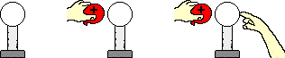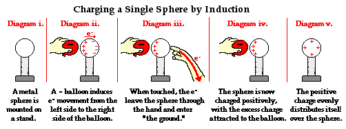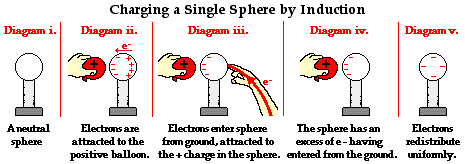 To further illustrate the importance of a ground, consider the induction charging of a single conducting sphere. Suppose that a negatively charged rubber balloon is brought near a single sphere as shown below (Diagram ii). The presence of the negative charge will induce electron movement in the sphere. Since like charges repel, negative electrons within the metal sphere will be repelled by the negatively charged balloon. There will be a mass migration of electrons from the left side of the sphere to the right side of the sphere causing charge within the sphere to become polarized (Diagram ii). Once charge within the sphere has become polarized, the sphere is touched. The touching of the sphere allows electrons to exit the sphere and move through the hand to "the ground" (Diagram iii). It is at this point that the sphere acquires a charge. With electrons having left the sphere, the sphere acquires a positive charge (Diagram iv). Once the balloon is moved away from the sphere, the excess positive charge redistributes itself (by the movement of remaining electrons) such that the positive charge is uniformly distributed about the sphere's surface.